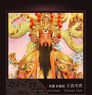 「文昌」本名星官名,是六顆耀星的總稱,因為古代星相術家將其解釋為主大貴的吉星,道教也尊其為主宰功名祿位之神,所以又稱為「文星」或「文曲星」。由於科舉功名是古時為官仕途的唯一途徑,所以文昌君尤為士人崇奉膜拜,仁宗皇帝曾尊封為「輔文開化文昌司祿宏仁帝君」,民間則暱稱「文昌帝君」。此外民間尚有《文昌帝君陰騭文》經書傳世,此經書是一本託名文昌帝君勸說世人行善積德的勸善書,十分流行,與《太上感應篇》及《關帝覺世真經》同列三大勸善名書。 本宮基於在學學生頂禮膜拜文昌帝君之需求,特於光明殿崇奉文昌帝君金身寶相,並設有文昌燈供學生信眾祈祐金榜題名,學運亨通,是本宮重要的祀神之一。
